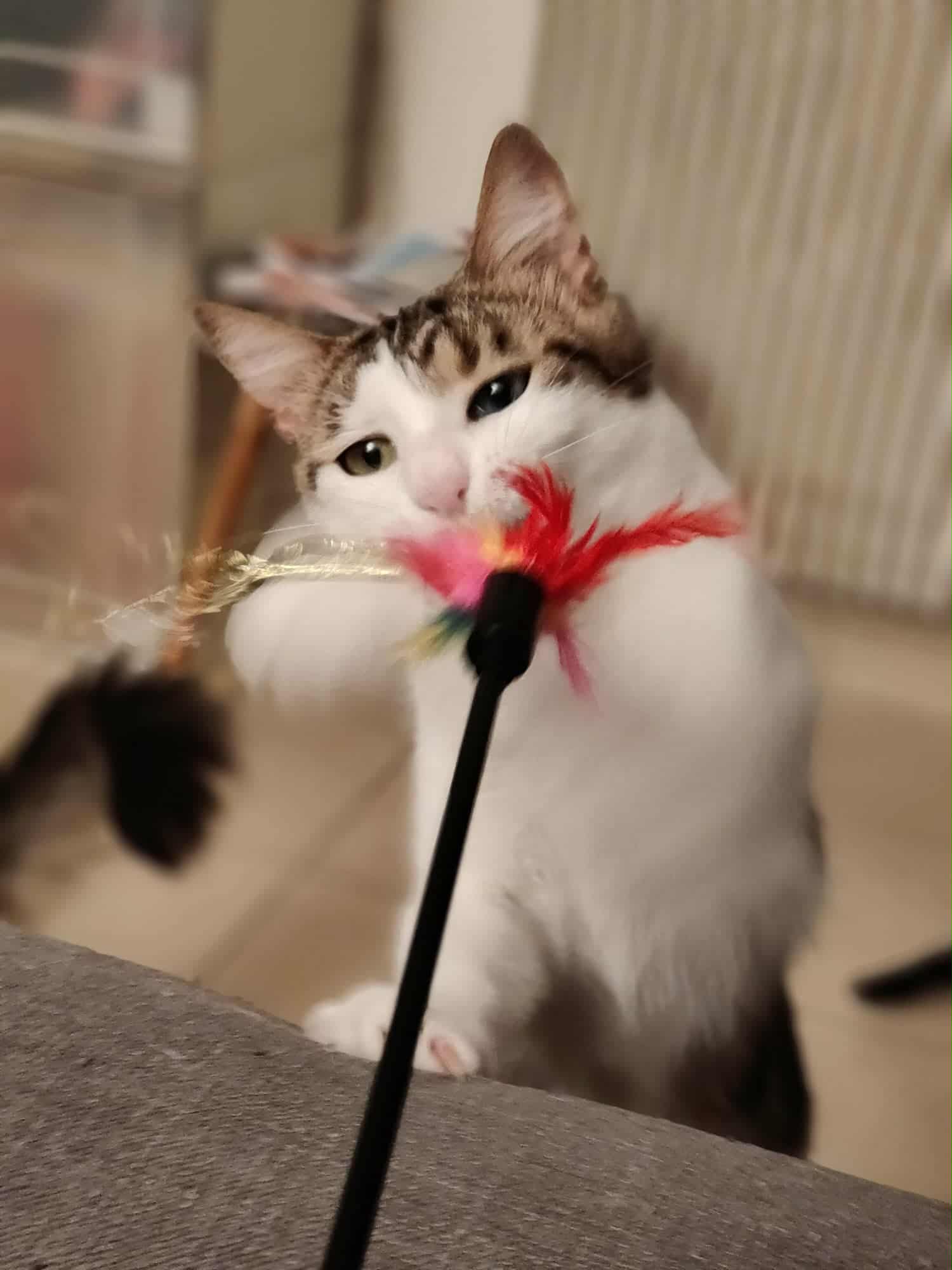 Il est gourmand, et accepte donc de prendre les friandises directement dans la main de sa famille d’accueil.