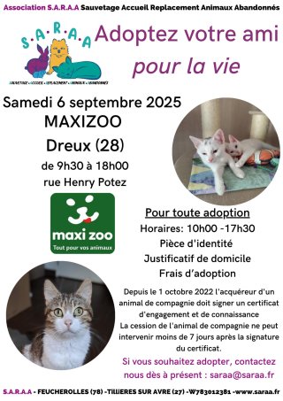 Nous vous présenterons certains de nos pensionnaires à la recherche d’un foyer définitif Samedi 6 Septembre 2025 de 09h30 à 17h30 au Maxizoo de Dreux (rue Henry Potez, 28100 DREUX).